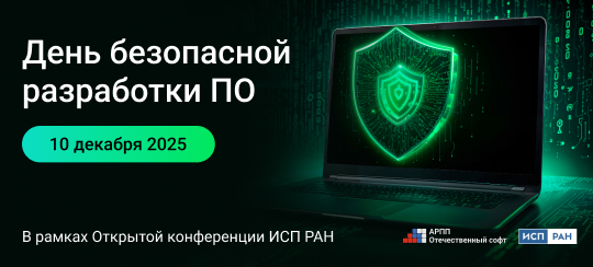 Уже 10 декабря в кластере «Ломоносов» пройдет пятый День безопасной разработки ПО. Мероприятие состоится в рамках Открытой конференции ИСП РАН. Организатор — Ассоциация разработчиков «Отечественный софт» при участии ИСП РАН им. В. П. Иванникова.